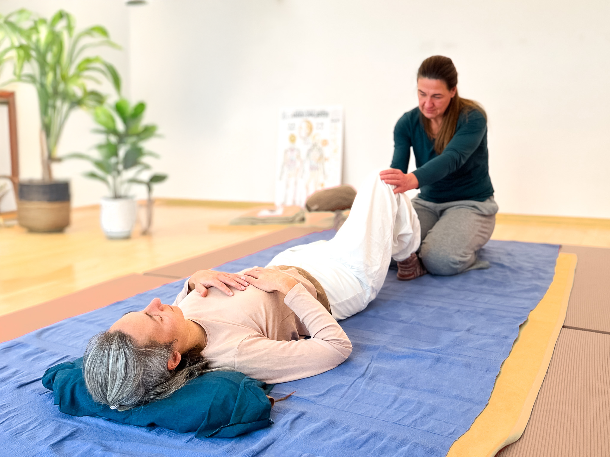 Die Shiatsu-Behandlung erfolgt als Ganzkörperbehandlung von Kopf bis Fuß. Du liegst dabei in der Regel entspannt auf einer Matte am Boden. Die Behandlung wird individuell an dein Befinden angepasst.